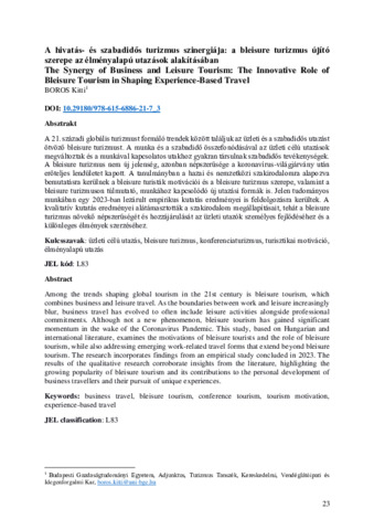 A 21. századi globális turizmust formáló trendek között találjuk az üzleti és a szabadidős utazást ötvöző bleisure turizmust. A munka és a szabadidő összefonódásával az üzleti célú utazások megváltoztak és a munkával kapcsolatos utakhoz gyakran társulnak szabadidős tevékenységek. A bleisure turizmus nem új jelenség, azonban népszerűsége a koronavírus-világjárvány után erőteljes lendületet kapott. A tanulmányban a hazai és nemzetközi szakirodalomra alapozva bemutatásra kerülnek a bleisure turisták motivációi és a bleisure turizmus szerepe, valamint a bleisure turizmuson túlmutató, munkához kapcsolódó új utazási formák is. Jelen tudományos munkában egy 2023-ban lezárult empirikus kutatás eredményei is feldolgozásra kerültek. A kvalitatív kutatás eredményei alátámasztották a szakirodalom megállapításait, tehát a bleisure turizmus növekő népszerűségét és hozzájárulását az üzleti utazók személyes fejlődéséhez és a különleges élmények szerzéséhez.