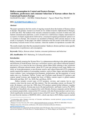 Gajzágó Éva Judit és Dávida Viktória Ramóna és Trang Nguyen Thanh Thuy (2025) Hallyu consumption in Central and Eastern Europe. In: Szemelvények a BGE kutatásaiból 2024. Budapesti Gazdaságtudományi Egyetem, Budapest, pp. 42-50. ISBN 978-615-6886-21-7